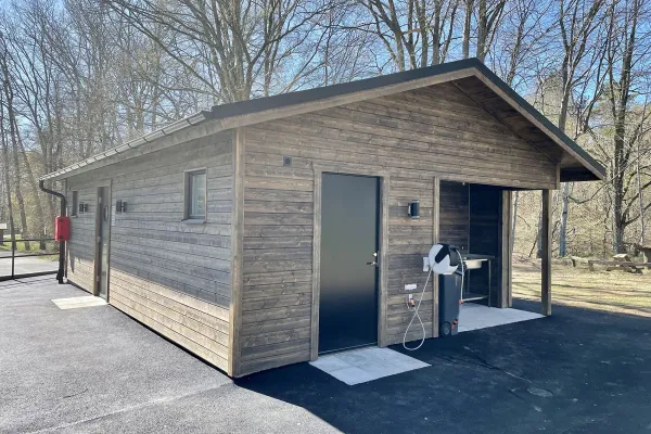 I servicehuset finns handikappanpassade toaletter och duschar, pentry för matlagning, diskplats, tvättmaskin och möjligheter till latrintömning (både för fast och löstagbar latrin).