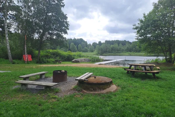 Friluftsområde vid insjö med sittbänkar, grillplats och toalett.