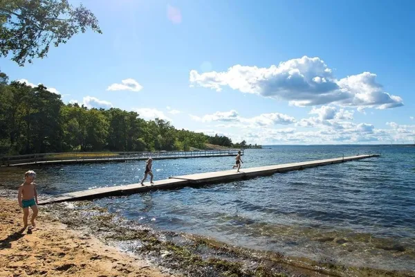 Sternö badplats har en långgrund sandstrand med bryggor och klippor.