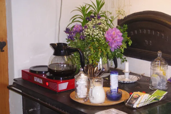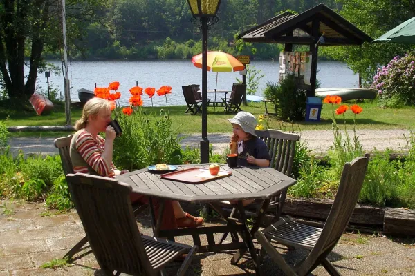 Njut av hembakade kakor och annat smått och gott i camping Hjorthålans trädgård intill Ronnebyån eller inomhus.