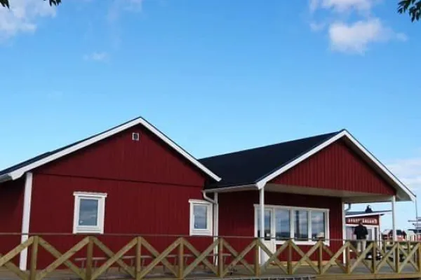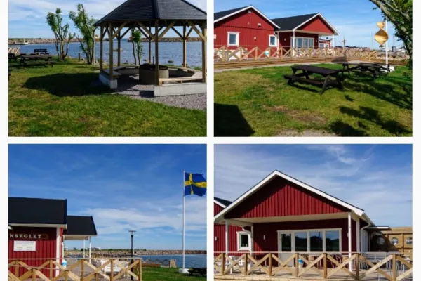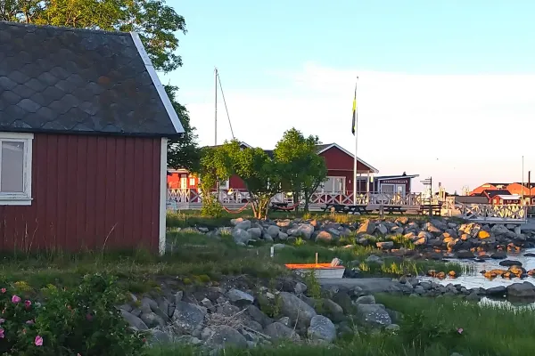 Übernachten Sie mitten im Hafen im Inseglets Hostel. Von hier aus haben Sie einen Blick auf die Bucht im Hafen von Nogersund.