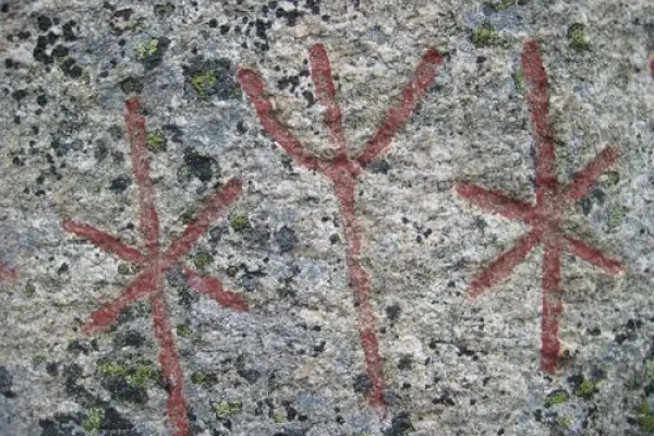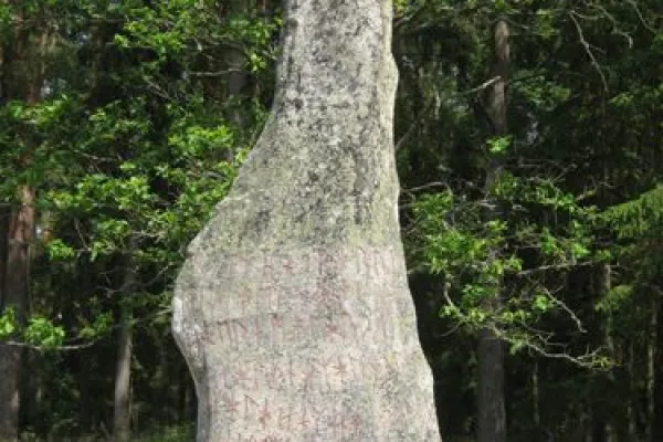 The rune stone is flanked by two tall standing stones. The three stones forming a triangle and mentioned in writing for the first time in 1493, as the landmark between Edestad, Listerby and Hjortsberga parishes. Near the rune stone and the other two blocks are a burial ground which dates from the Migration Period, 400-800 AD.The rune stone is just over 4 meters high and has a Primitive Norse inscription, a curse formula. "Mighty runes secret I hid here, powerful runes. Whoever breaks this memorial is constantly tormented by anger. Betrayal death will befall him. I trace depravity." The inscription is from the late 600s AD