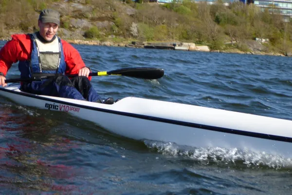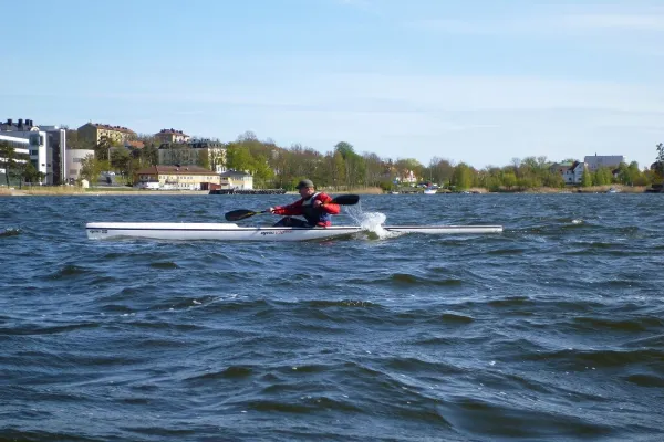 Test to kayak with a surfski in the small waves of archipelago of Karlskrona.