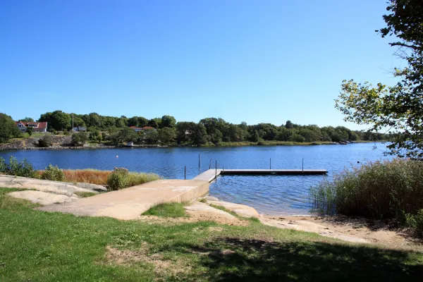 Vackert belägen badplats med utsikt över öarna Fäjö och Säljö.
