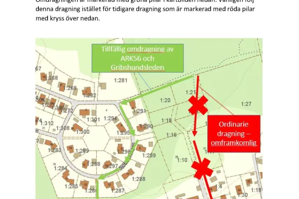 ARK56-leden ”Vandringsled Ekenäs-Brunnsskogen” och Gribshundsleden har en tillfällig omdragning med anledning av skogsavverkning och nybyggnation. Omdragningen är markerad med gröna pilar i kartbilden nedan. Vänligen följ denna dragning istället för tidigare dragning som är markerad med röda pilar med kryss över nedan.