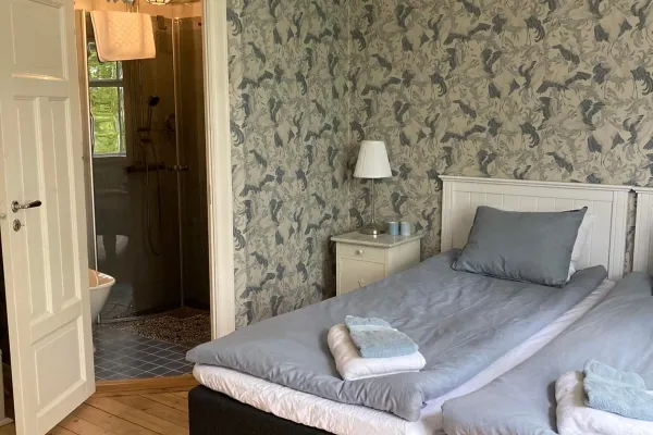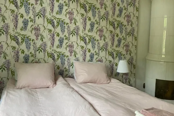 Blåregnet är ett litet tvåbäddsrum med kakelugn med privat tillgång till badrummet innanför köket.