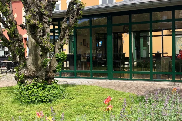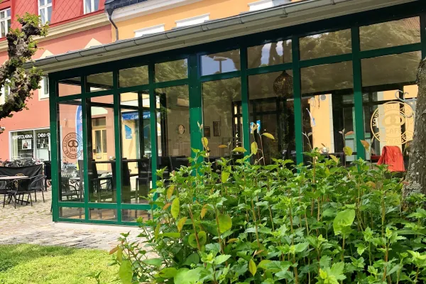 Njut av fika på deras glasveranda med härlig grönska utanför.