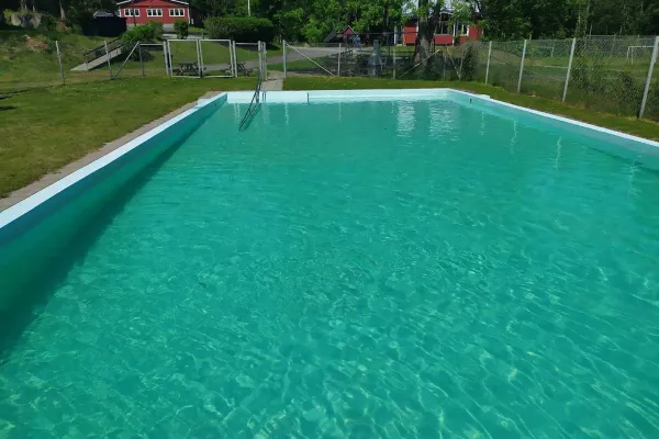 Unik fritidsanläggning med stugor och pool i sjönära naturområde.