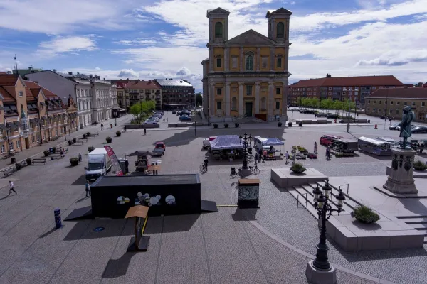 Ett av norra Europas största stenbelagda torg.Många besökare fascineras av det stora torget, . Statyn av Karl XI, stadens grundare, blickar ut över det pampiga stenbelagda torget. Intresset fångas genast av de imponerande kyrkorna, Fredrikskyrkan och Trefaldighetskyrkan, även kallad Tyska kyrkan. Kyrkorna är ritade av Tessin d.y efter förebilder från Rom.