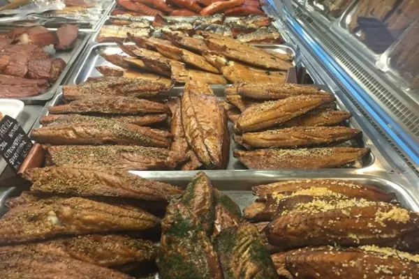 The shop sells smoked, fresh and fried fish as well as bread, sauces and salads. A certain range of products is also available at Extra Mjällby.For current prices visit www.hennings-rokeri.se