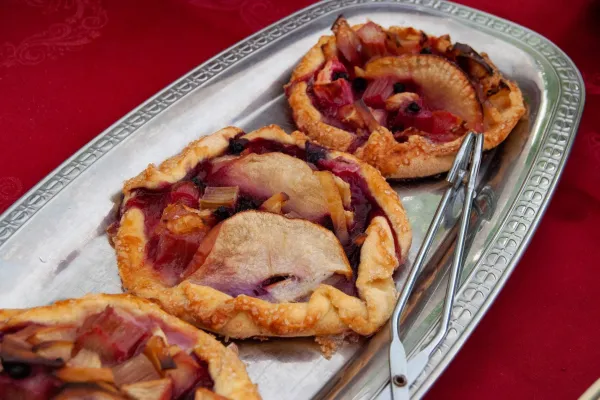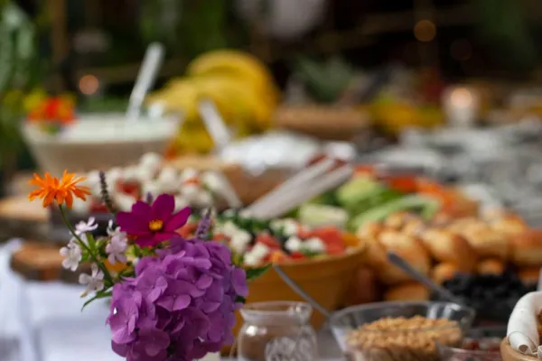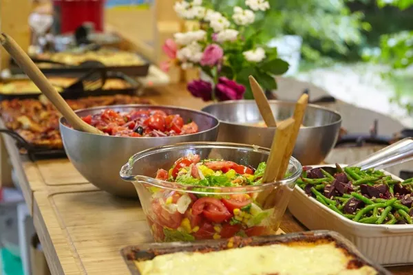 The cafe serves a homemade vegetarian buffet. There are also vegan and gluten-free options available to order. In addition to the buffet, cakes, coffee and other drinks, ice cream, waffles, sweets and pancakes are also offered.