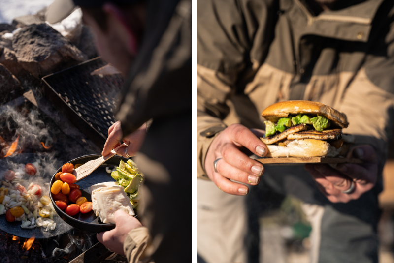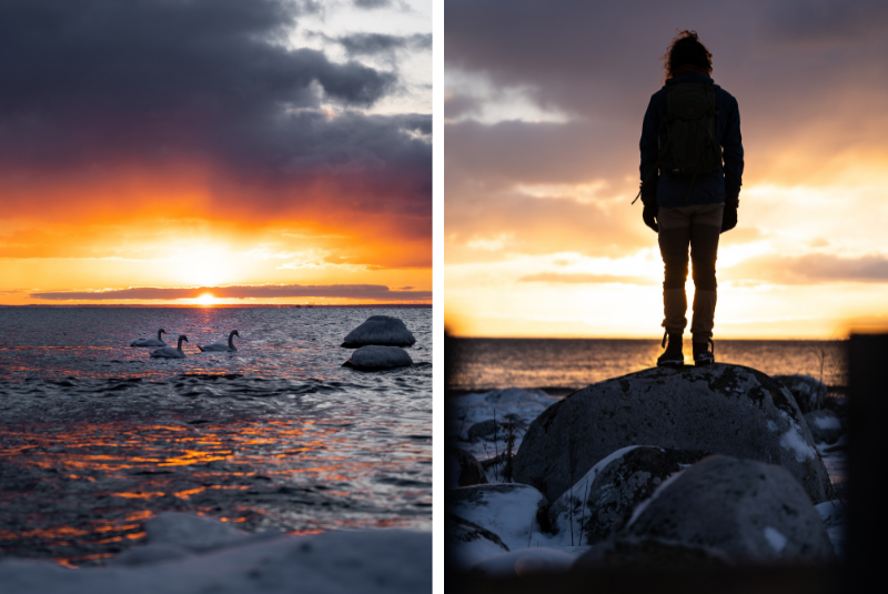We found shelter at a fireplace overlooking the sea just as the sun peeked through the clouds. The fire was lit, and the frying pan was taken out of the bag. Forrest fried and assembled incredibly tasty vegan burgers and Mikko made the after-meal coffee. A recipe for a wonderful day!