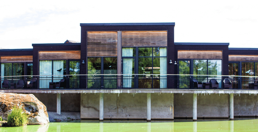 Ett modernt hotell med träfasad och stora fönster ligger inbäddat i Blekinges gröna landskap. Solen faller mjukt över gräset och stenarna i förgrunden, vilket ger en harmonisk känsla av lugn och natur. Bilden representerar Blekinges unika kombination av modern arkitektur och hållbar närhet till naturen – en perfekt plats för vila, möten och upplevelser.