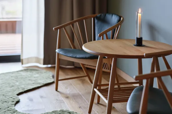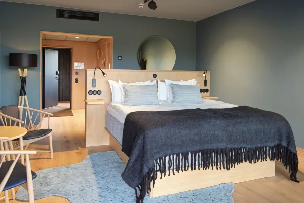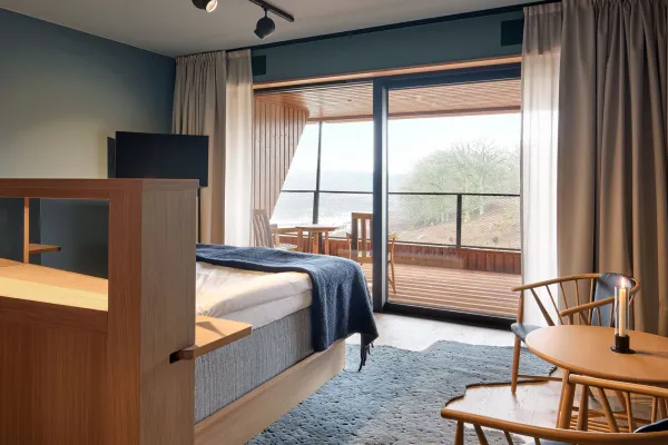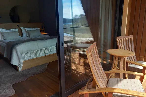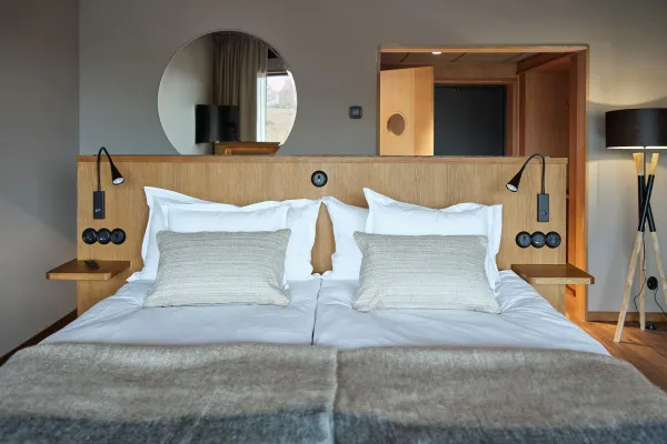 De sköna sängarna är centrerade i rummet och placerade så att du kan ligga och titta ut genom stora glasfönster. Här bor du mitt i naturen och har möjlighet att uppleva djur och natur på nära håll. Kanske får de se några visenter och kronhjortar som betar nedanför rummet eller örnar som gör cirklar på himlen.