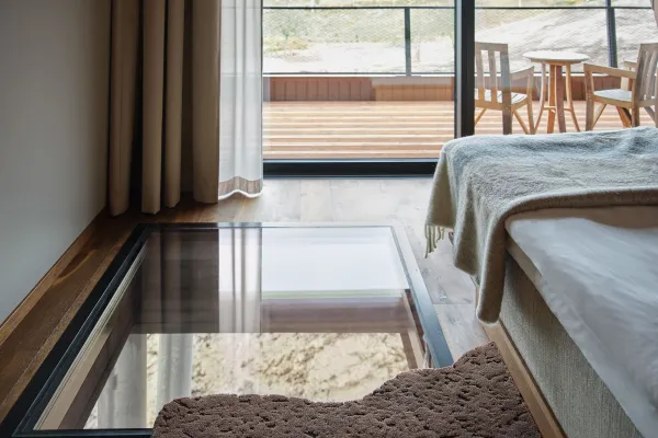 Några av de rymliga rummen har glasgolv som vetter mot en matplats under byggnaden.