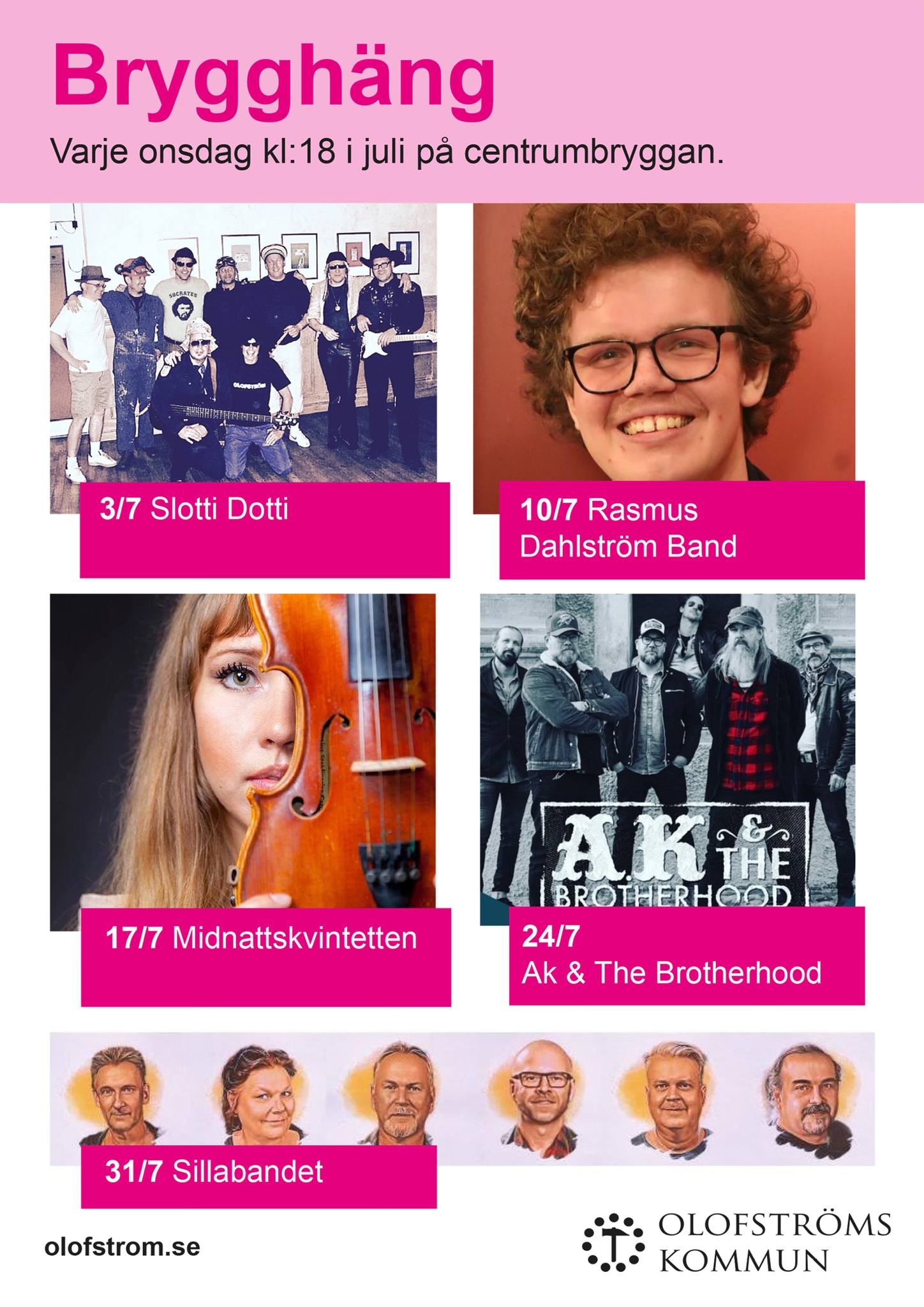 Fem onsdagskvällar i juli förvandlas Centrumbryggan i Olofström till en scen fylld av musik, mat och gemenskap – alltid med den fria entrén och den somriga stämningen vid Holjeån.