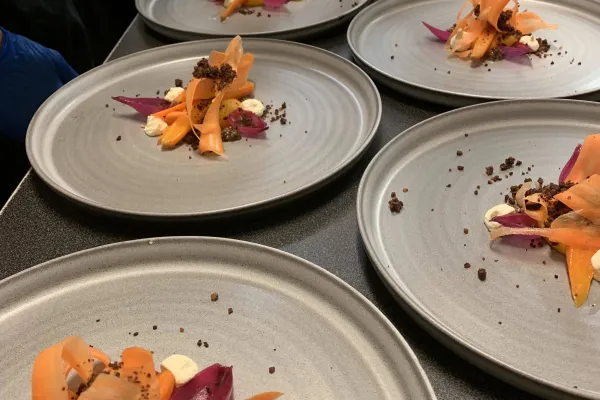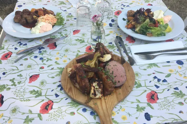 På Blåregn serveras alltid svenskt kött, fågel och färsk fisk. Grönsaker kommer i störst möjliga mån ifrån lokala odlare.