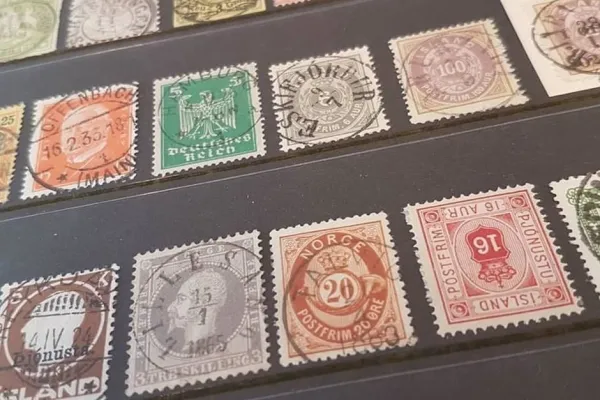 Försäljning av gamla och nya frimärken, mynt och vykort.