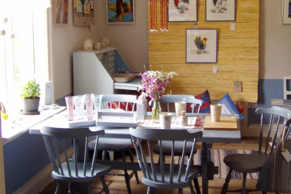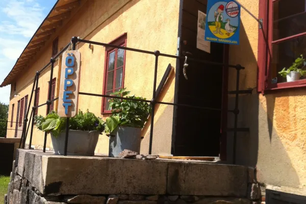 Efter en rundvandring både ute och inne smakar det kanske bra med kaffe och hembakta kakor från serveringen. Man kan välja att sitta ute eller inne i stora salen. Föranmälan gärna större sällskap.