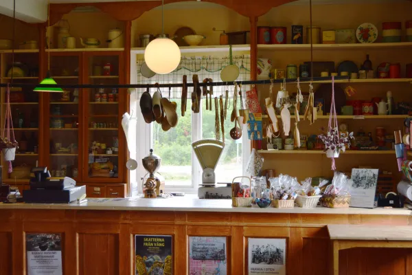 I den tidstypiska handelsboden kan besökaren köpa glass, karameller i strut, honung och vykort. Dessutom finns en mängd varor med känsla från den tid då handelsboden var i drift.