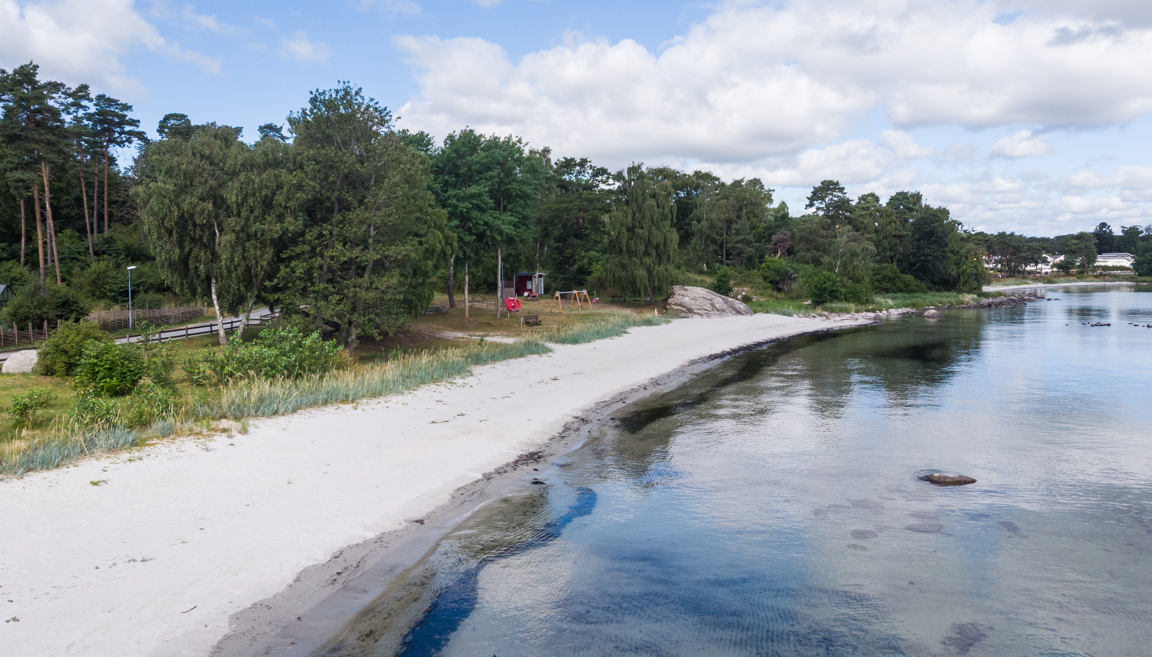 En livlig strand vid fiskeläget, med brygga, lekpark, och glasskiosk. Här finns också hundbadplatser.