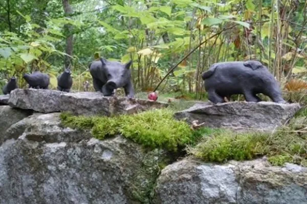 Stenbrotten i skogen är spår av stenbrytarnas arbete. Här kan vi lära om både suggor och knott.