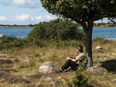 Höst i Blekinge - Lutar sig mot ett träd, badar i soljus och lyssnar i hörlurar