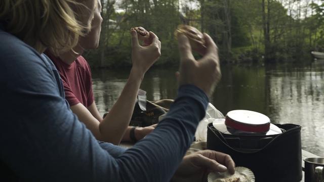 Vi går norrut, först längs en liten landsväg med fält på båda sidorna. Snart kommer vi bort från asfalten, in på en grusväg och ner till ån. Längs Mörrumsån möter vi flera fiskare som står ute i vattnet och fiskar lax. Vi pratar med både svenska och utländska fiskare. De tycker alla att det är en magisk plats. Det är lätt att hålla med. Här tar vi en fikapaus och njuter av solen, vattnet och fåglarna. Vi fortsätter längs åkrar, genom bokskogar, längs grusvägar, förbi vindskydd och eldstäder. Vi tar nästa paus i en glänta i bokskogen, precis intill vattnet, där ån gör en stor sväng. Vi ser en skygg kungsfiskare, kanadagäss och tärnor som flyger fram och tillbaka, precis över vattenytan. Såhär på våren är det bråda dagar med massa